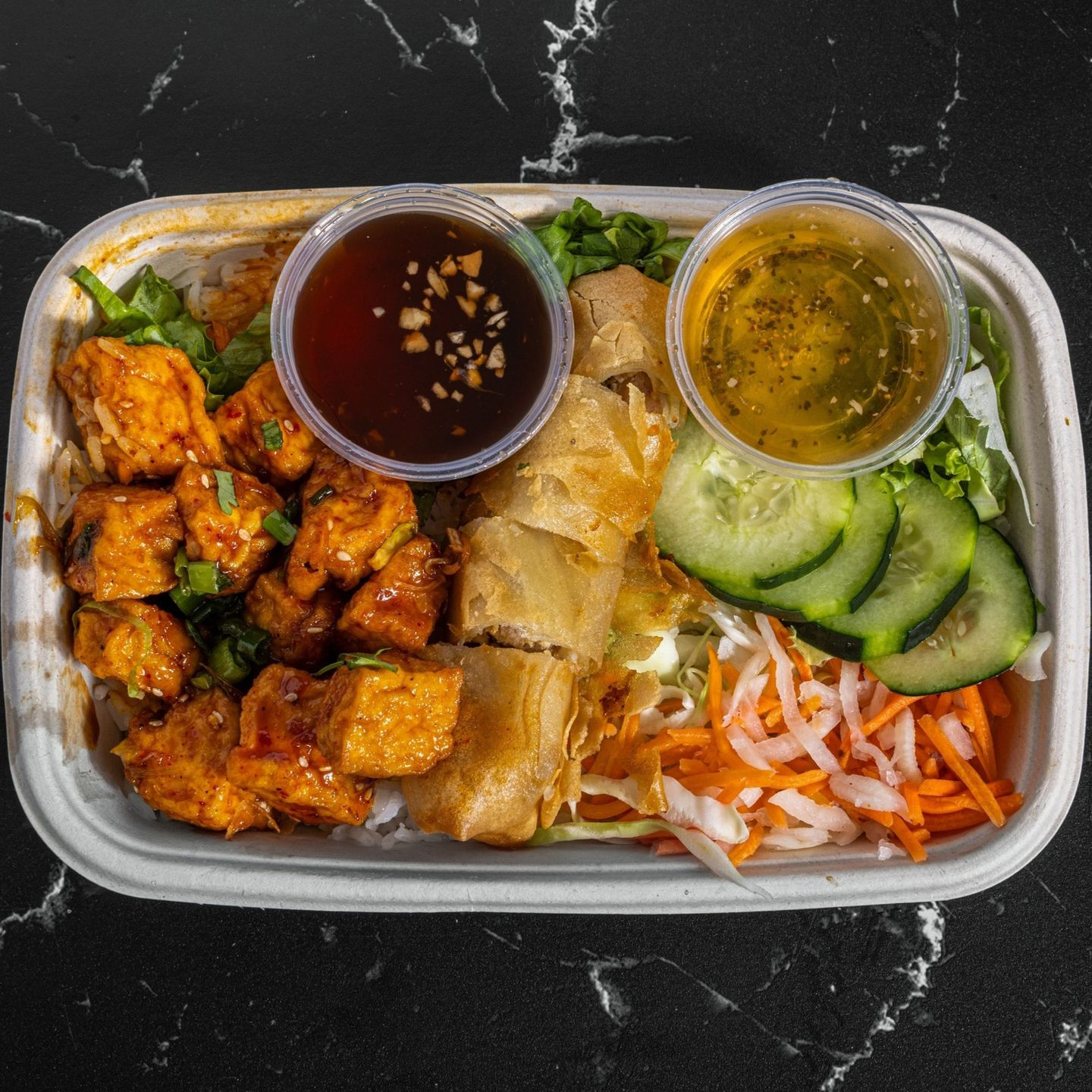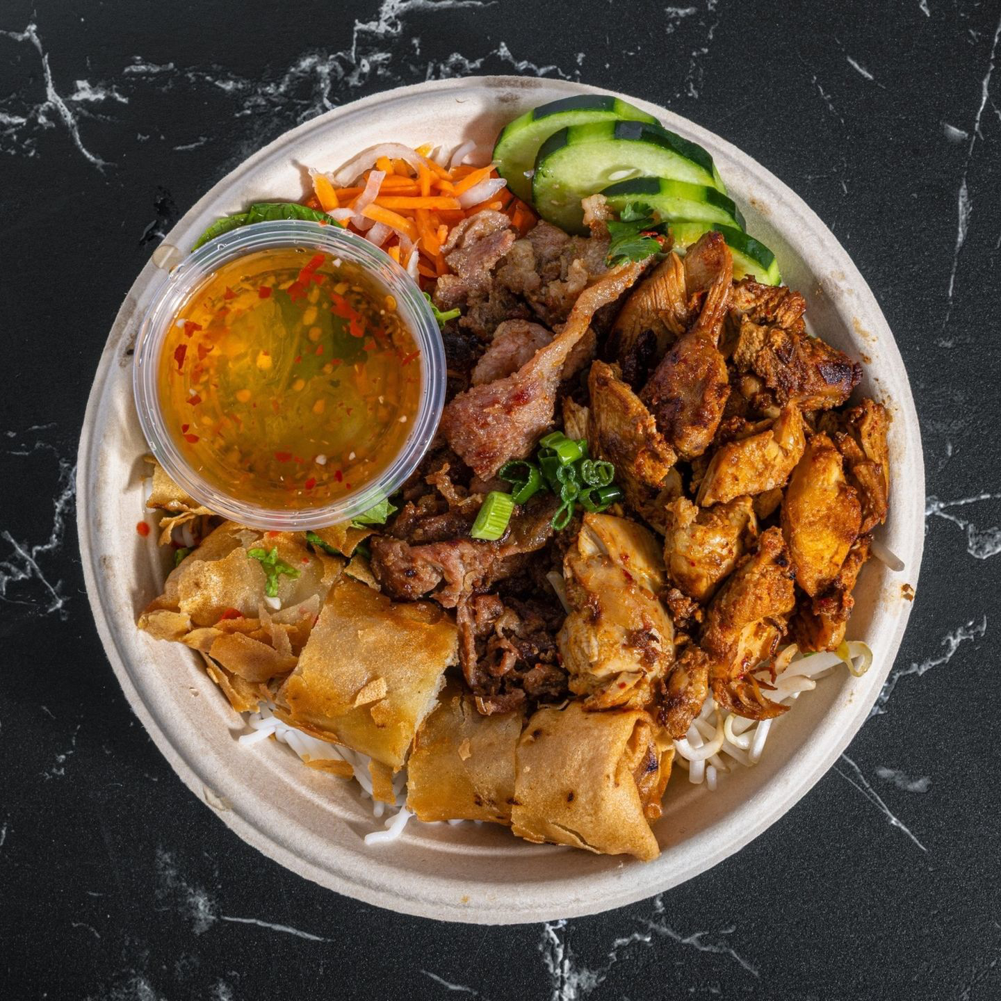 White rice with your choice of protein, shredded pork, scallion oil, and a side salad of cabbage, lettuce, pickled veggies, and cucumbers. Comes with house sauce and Vietnoms vinaigrette.