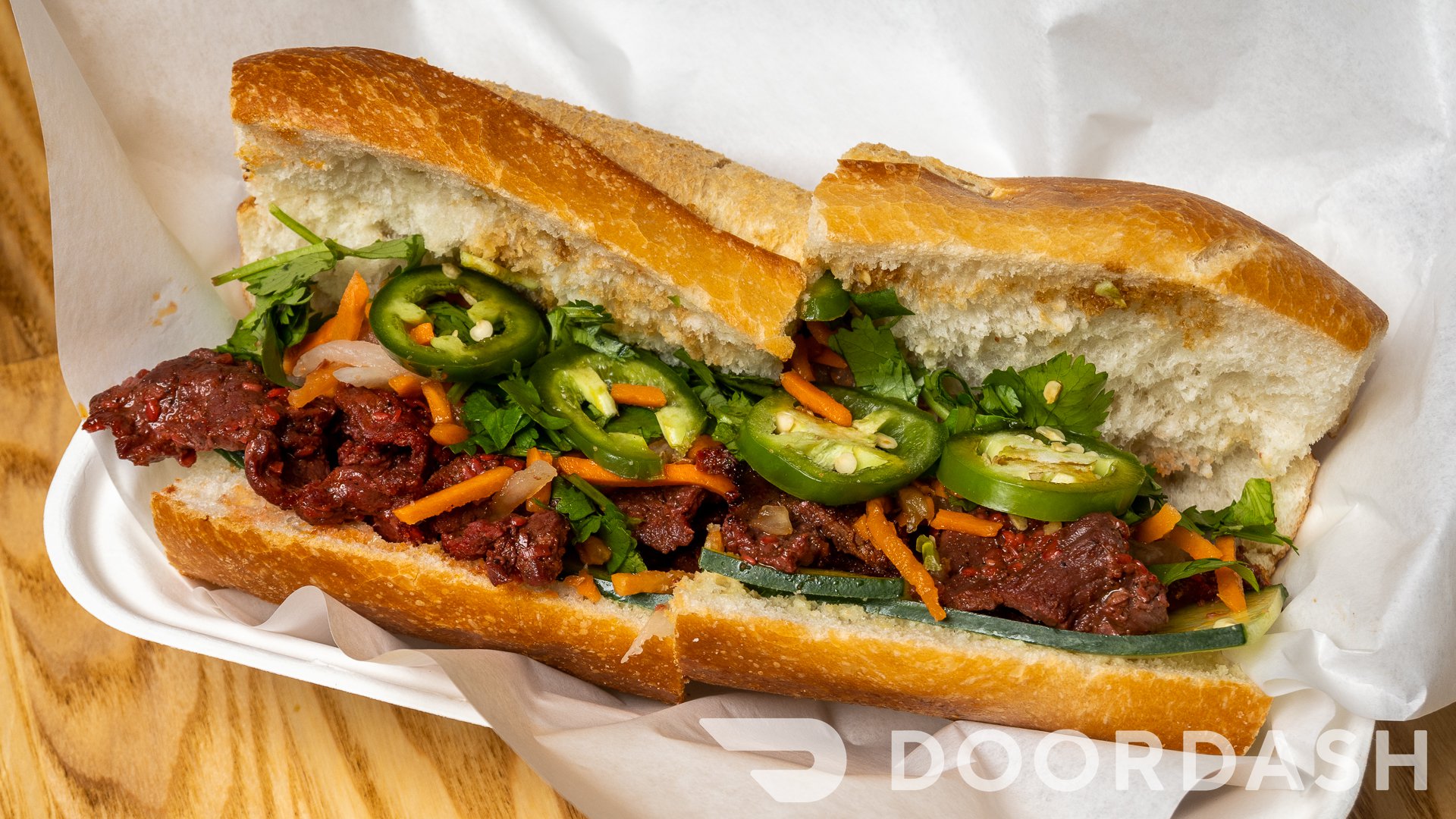 Banh Mi sandwich with your choice of protein served on a baguette with housemade mayo, cucumber, pickled veggies, cilantro, Maggi seasoning, jalapenos.
