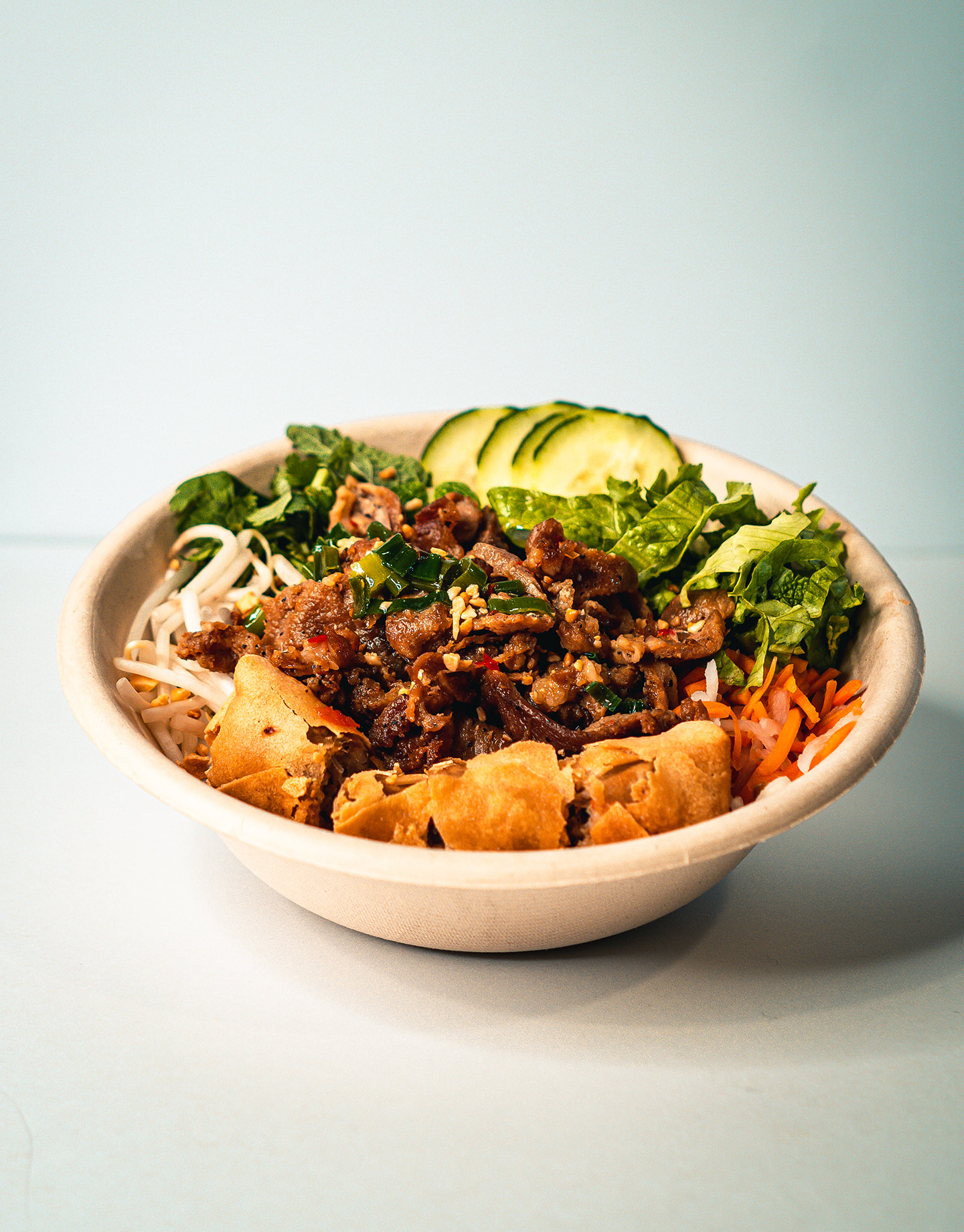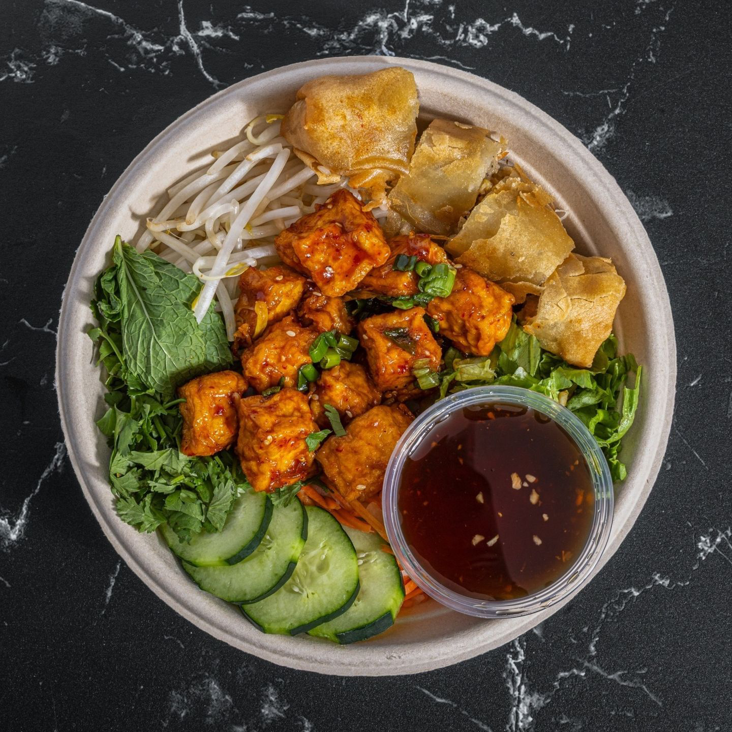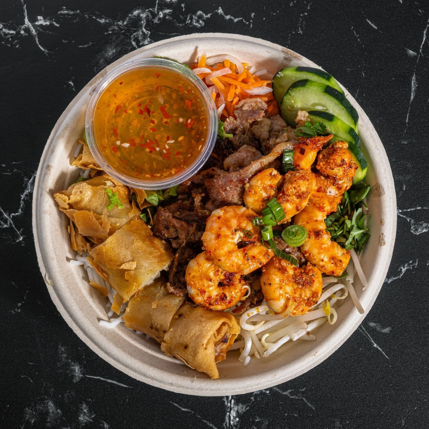 Our Signature Dish! Vermicelli rice noodle with your choice of protein, pork&shrimp or vegan egg roll, lettuce, cucumbers, pickled veggies, mint, cilantro, bean sprouts, and house sauce.