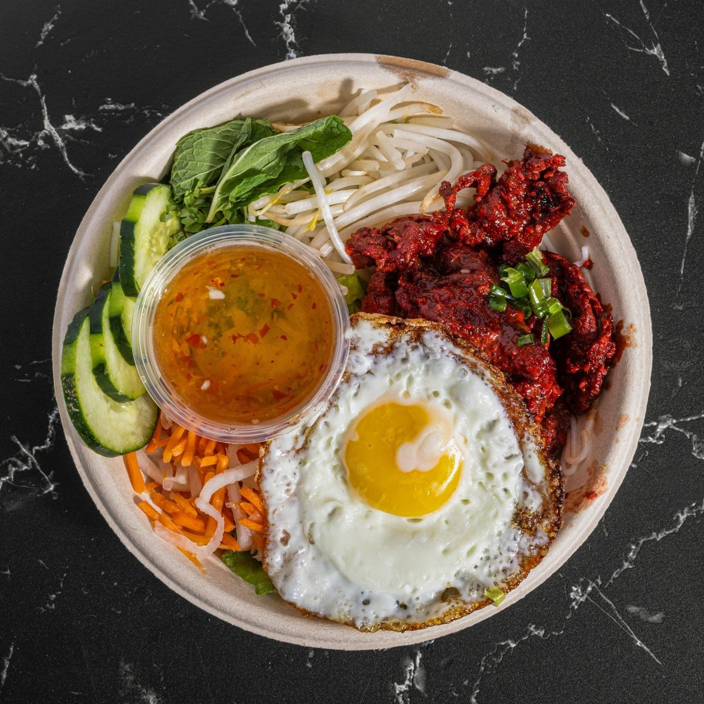 A gluten-free Vermicelli Bowl with Red Hot Beef and a Fried Egg with lettuce, cucumbers, pickled veggies, mint, cilantro, bean sprouts, and house sauce.