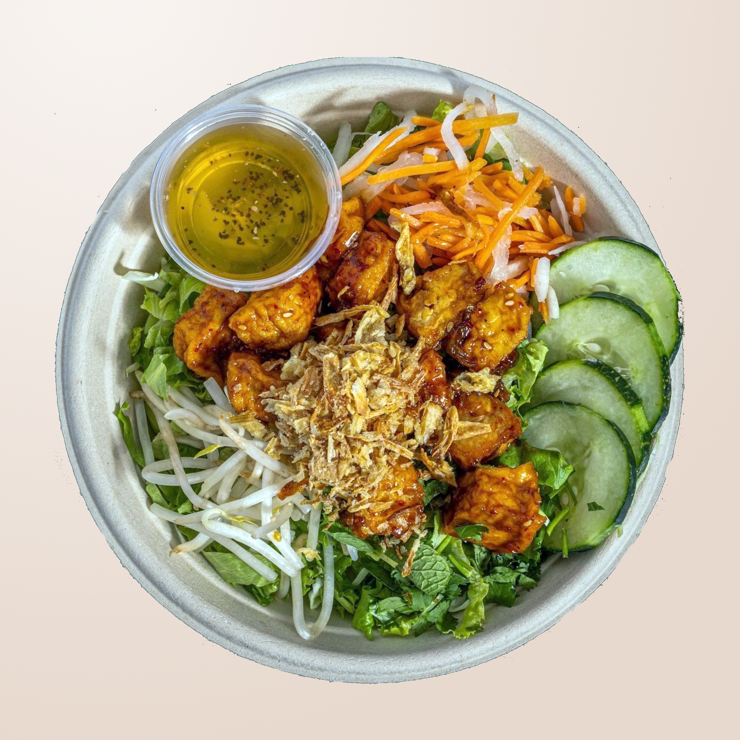 Salad with cabbage/lettuce slaw and your choice of protein, pickled veggies, cucumbers, mint, cilantro, bean sprouts, and fried shallots